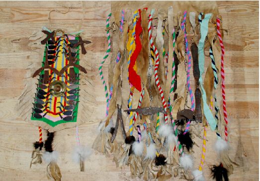 腰裙下擺的前后配戴著50個銅鈴,以此代表眾多神靈的福音。腰裙上還系著一對熊神和一對狼神偶體,因為鄂溫克人認為熊是人類的祖先,人們不能輕易傷害獵取,如果一旦打死熊,也要對熊骨進行風葬。而狼據(jù)說是神靈的兒子。這些又都可見薩滿信仰又與鄂溫克人在原始社會條件下的自然崇拜、祖先崇拜有著非常緊密的淵源關系。