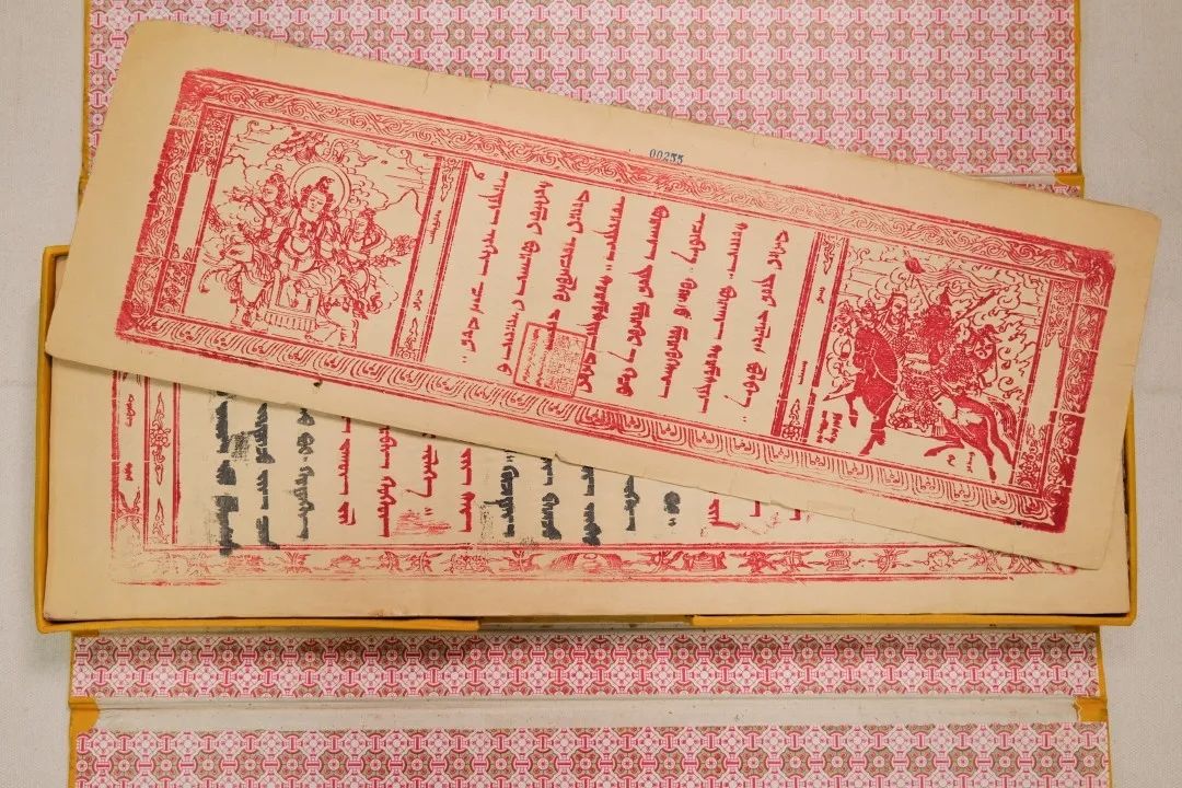 今天我們主要講述的是1716年北京木刻本蒙古文《格斯?fàn)杺鳌罚ㄈQ為《十方圣主格斯?fàn)柨珊箓鳌罚┦乔蹇滴跷迨迥辏?716)北京木刻本。梵夾裝,1卷(176葉),每頁26行,每行6個字,約5萬多字,頁面高17.2cm、寬52cm,版框高13.5cm、寬46.5cm。版框左側(cè)有漢文《三國志》三字,首頁刻有朱印佛像。