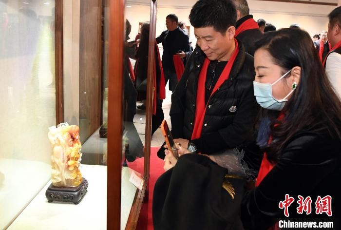 中國工藝美術大師葉子賢壽山石雕傳承展吸引觀眾觀看。 記者劉可耕 攝