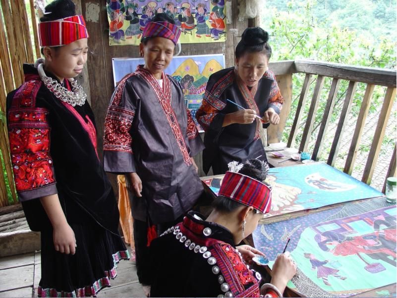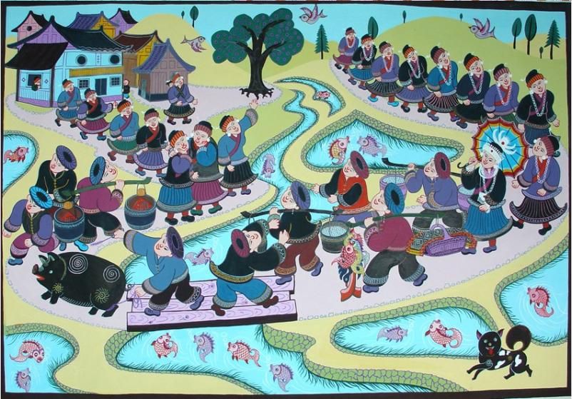 劍河現(xiàn)代民間繪畫源于傳統(tǒng)的苗族刺繡文化,是苗族刺繡文化的另一種表現(xiàn)形式和藝術(shù)升華。傳統(tǒng)的苗族文化多以服飾、歌舞為載體,并以刺繡及演唱等形式進行表現(xiàn)和傳承。早期劍河現(xiàn)代民間畫即脫胎于具有適用性的苗族刺繡樣稿——剪紙和手繪刺繡粉本,換言之,手繪的苗族刺繡粉本便是劍河現(xiàn)代民間繪畫的雛形,劍河第一批優(yōu)秀的現(xiàn)代民間畫作者,即是原當(dāng)?shù)厥掷L粉本的能工巧匠。劍河現(xiàn)代民間繪畫多以苗族神話傳說中的故事情節(jié)和民俗節(jié)日、生產(chǎn)活動等內(nèi)容為題材入畫,素材涵蓋自然界花鳥蟲魚及人物、家畜等具體形象,造型稚拙天真,設(shè)色濃艷,對比強烈。作品傳達出典型的地域民俗氣息及濃厚的鄉(xiāng)土味,便是其標(biāo)志性特征。