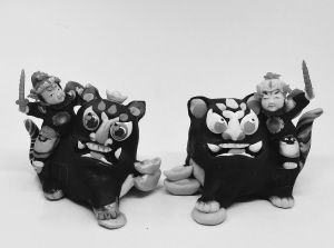 泥叫虎是山東高密的一種民間泥塑,起源于明代萬歷初年,是形、色、聲、動俱佳的民間工藝品,與撲灰年畫、剪紙并稱為“高密三絕”。泥叫虎腰部由牛皮連接,擠壓其頭部和尾部后,會發(fā)出響聲,叫虎一名由此而來。河南也有叫虎,又稱皮老虎。相較之下,山東的泥叫虎更具特色,而且在藝術(shù)風(fēng)格上更大氣,樣式憨態(tài)可掬,哨子發(fā)出的聲音也十分有趣。