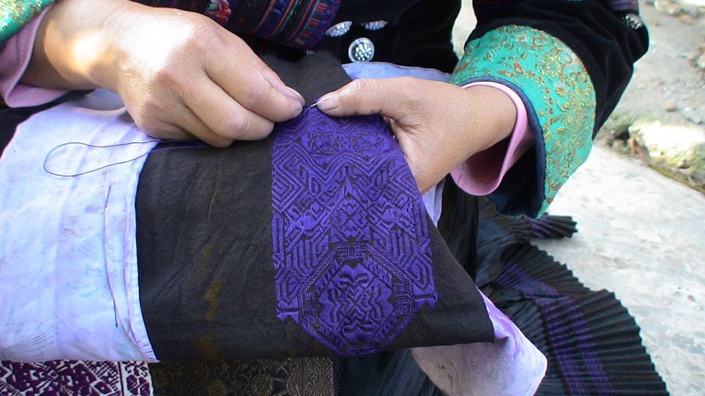 服裝的挑花刺繡均是依照布料的經緯戳針,在繡法上多有變化,如平繡、數紗繡、織繡等,其紋樣層層疊套,圖案工整對稱,其繡技與織技完美統(tǒng)一,巧奪天工,具有很強的立體感。體現了苗族獨特的正挑反針挑花、刺繡、織繡等精湛工藝。