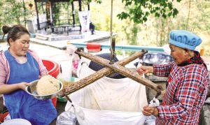 在村里修復(fù)舊屋的趙貢彩接到游客電話,馬不停蹄地趕回家中,自家手工制作的苕粉成了游客心心念念的香餑餑。拿出早已生銹的秤桿,一袋袋苕粉被游客搶著購買?!岸际橇糁约页缘模南胫苜u出去喲。”笑著說罷,趙貢彩拿出手機,微信一掃,錢款立即到賬。