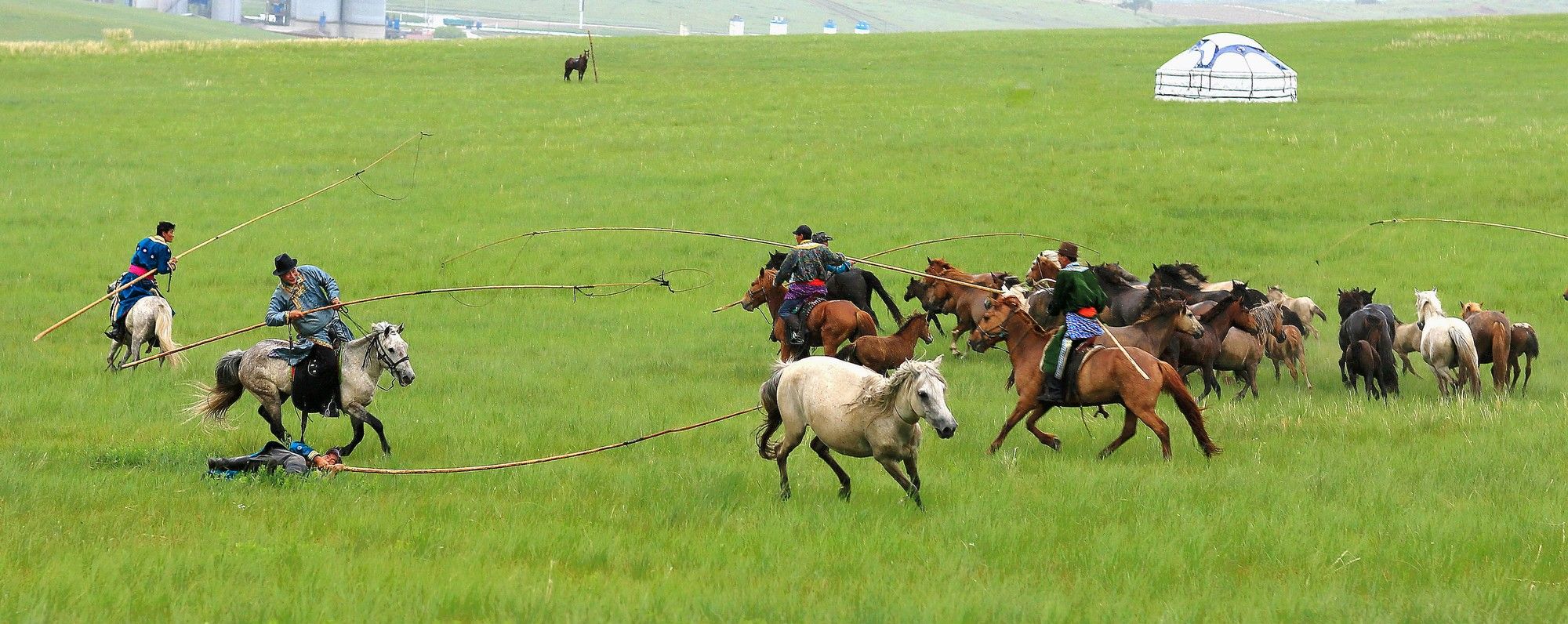 繩索套馬是蒙古族的傳統(tǒng)體育活動(dòng)。原為牧民放牧?xí)r約束馬匹的一種手段。比賽時(shí),選一烈性難馴的馬,先令其疾馳。參賽的成群騎手,手持打有活結(jié)的繩索,騎馬緊追,到一定距離,拋出繩索套馬,以先套準(zhǔn)并能束住烈馬者為勝。