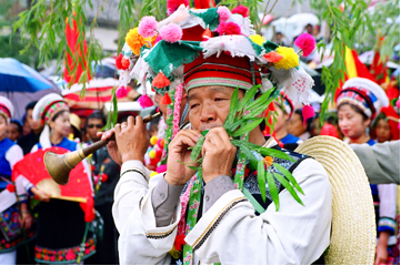 新娘的首飾主要由耳環(huán)、銀鐲、針筒銀鏈和戒指等構(gòu)成,其中銀質(zhì)手鐲和針筒銀鏈大都出自本地工匠之手。主要是因?yàn)樵邡Q慶以北的新華村早就是聞明世界的制銀之鄉(xiāng),銀手鐲一般分為“細(xì)絲”、“粗絲”和“粗夾細(xì)”三種。細(xì)絲就是用較細(xì)的銀絲(直徑0.1厘米)制作成直徑為l.5厘米的繩狀手鐲;粗絲則用0.2厘米銀絲做成;粗夾細(xì)是用上述兩種銀絲混合制做而成的。銀手鐲式樣的選擇取決于新娘的喜歡。而針筒銀鏈長40厘米,它是由l2條銀鏈排列組合,在銀鏈的中段有“石鎖”狀的飾物連接下部,銀鏈下端綴有栩栩如生的十二生肖屬相,針筒銀鏈掛在胸的左前側(cè),但也有掛紅色或綠色方巾的,即實(shí)用,又能起裝飾作用。耳環(huán)、戒指和玉鐲等其它飾件一般由自己準(zhǔn)備,但也有親友贈送的或是由婆家送的。整套服飾有容華貴,明快之中顯素雅,繡艷之中見端莊。