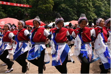 以大理市為主要代表的洱濱區(qū)白族服飾。如周城、喜洲、挖色等白族服飾,他們世代伴水而居,生活環(huán)境十分優(yōu)越,服飾給人一種清新明快的感覺。在很大程度上折射出這種環(huán)境的優(yōu)越性,周城村白族男服飾過去的穿著較為復(fù)雜,纏白布包頭,上衣穿立領(lǐng)對襟布紐衣,俗稱“三滴水”,最里的一件穿白色、中間一件穿藍(lán)色、最外一件穿黑色或是藏青色的外衣,三件衣服都是敞開著,露出內(nèi)穿的兜肚,外穿一件麂皮或山羊皮的領(lǐng)褂,下穿白或藍(lán)色大襠褲,腳穿布底剪口鞋。肩掛繡花掛包。而現(xiàn)在的男裝基本與漢族相同,平時需要穿戴的民族服裝也是改良過較為簡潔的男裝,只有在重大節(jié)日的時候才能看到傳統(tǒng)的著裝風(fēng)采。而女裝的穿戴至今還保持得較為完整,以白、藍(lán)兩色為主,沿承了白族崇尚白色的傳統(tǒng)特點(diǎn),上身穿白色緊袖裳,外套紅或藍(lán)色右衽領(lǐng)褂,在領(lǐng)褂的紐扣上掛三須或五須銀鏈,銀鏈上綴掛件,有銀質(zhì)的針筒、魚、牙簽、耳勺。手戴金、銀或玉手鐲、戒指。耳戴金、銀耳墜。手袖上套滾邊的大袖小袖,并在袖上鑲各式花邊。腰系繡花短圍裙或系凈白色底外鑲一圈黑色邊的素面短圍腰。下穿白或藍(lán)色滾邊長褲,褲腿邊鑲寬窄花邊,花邊上面繡各類花卉圖案。腳穿繡花尖鞋,又名“白姐鞋”(“柏姐鞋”),鞋面為紅、粉、綠、黑等色,繡有艷麗的花紋。頭飾和過去的頭飾相比較從美術(shù)的角度上看要美得多,特別是姑娘的頭飾,過去傳統(tǒng)頭飾一般喜戴魚尾帽,還有我們在電影《五朵金花》中所看到過的姑娘頭飾,而今姑娘的頭飾讓人一看就聯(lián)想到大理的“風(fēng)花雪月”四大美景。頭戴色彩鮮艷的繡花頭巾,繡花頭帕上端精心梳理出茂密雪白的絨毛,形象的表現(xiàn)了蒼山頂上的皚皚白雪,將發(fā)辮盤繡花頭帕外,纏以大紅絨線,形如滿月,一側(cè)垂下雪白的纓穗飄飄灑灑,象征著終年吹拂的下關(guān)風(fēng)。整套服飾在很大程度上折射出這種環(huán)境的優(yōu)越性,如色彩搭配對比鮮明,簡潔明快,挑花精美,毫無細(xì)碎之感,裝飾繁而不俗等。