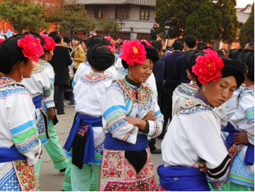 云南巍山彝族回族自治縣各民族如壯麗的織錦,將生活裝扮得五彩繽紛,充滿詩情畫意。其中特別是東山一帶的彝族服飾色彩較為豐富,款式變化多姿,并且以大量的銀制品和刺繡裝飾,制作工藝之精良,堪稱少數(shù)民族服飾一絕。以小孩帽而言,就有魚尾帽、小瓢帽、銀鼓帽、花帽和搭耳帽等數(shù)十種,名目繁多,式樣各異。帽子上都繡有花草、樹葉、龍鳳圖案,鑲嵌著閃亮的銀首飾,十分逗人喜愛。小孩的衣服式樣也很多,大多由紅、藍(lán)、綠、白幾種顏色的布料縫制而成,紅綠交織,藍(lán)白相襯,非常艷麗。如花朵一般的彝族少女通常頭戴銀鼓帽,墜耳環(huán)、身穿藍(lán)領(lǐng)褂,腰系花圍裙,下著綠彩褲,背掛圓裹背。銀鼓帽和繡花鞋做工極為精巧,全套裝飾花團(tuán)錦簇,恰似一只開屏的孔雀。結(jié)婚后的婦女就不再戴帽子,改為結(jié)發(fā)髻,裹包頭。發(fā)髻一般呈寶塔狀,外裹黑紗和黑布包頭,發(fā)髻上戴“別子”?!皠e子”其實(shí)就是發(fā)卡,均為銀制品,分為四串,每串有兩個(gè)燈籠繡球,兩個(gè)響鈴和兩尾小魚。包頭巾外再用銀串珠、亮球飾之。上衣著右衽大襟,前短后長(zhǎng)、領(lǐng)、袖及襟邊則鑲以多層不同的金銀絲瓣或自繡花紋的多層寬窄不同的花邊。外罩齊腰藍(lán)布短領(lǐng)褂,領(lǐng)口上安裝著七個(gè)用銀鼓釘湊成五個(gè)葉子,狀如葵花形,彝語叫“披巴”的裝飾。領(lǐng)褂四周皆用銀鼓釘鑲邊,共四排,每排36顆。一件領(lǐng)褂上需有兩百多顆銀鼓釘,加上胸前佩戴銀制的“三須”針筒,“菱角吊”串珠和雞心型繡花荷包,整個(gè)裝飾真是銀裝素裹,分外嬌嬈。腰間系的圍腰布上,鑲嵌多層金銀絲瓣或自繡圖案的花邊。圖案有串枝蓮、牡丹花、太陽花及鳳戲牡丹、丹鳳朝陽等。無論未婚和已婚婦女,背上都有一個(gè)用羊毛搟制而成的圓型繡花裹背,直徑約一尺不等,內(nèi)外兩層,中可承物,上繡兩對(duì)太陽花,一大一小,對(duì)稱排列。裹背除用作裝飾外,還可保護(hù)腰部,既有欣賞價(jià)值,又有實(shí)用價(jià)值,這在巍山彝族服飾中是最為典型的一件飾物。銀鼓帽繡有42朵小花,鑲有96顆銀鼓釘,帽頂插有花一朵或釘有櫻花一束。其帽形如金魚,魚頭魚身為帽,魚尾多岔分為護(hù)頸,亦稱為“魚尾帽”。繡花鞋呈船形或鳳頭形,鞋面繡有40余朵小花,紅色中夾有40余片綠葉。如果是新娘鞋,則用紅色或粉色的軟鍛做鞋面,更為講究。