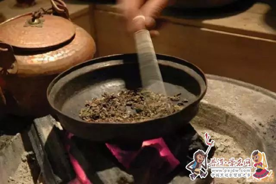 彝家糊米罐罐香茶烤罐要肚大口小,大小適中,茶具為土陶和紫砂制品為主。泡茶取無量山泉水,主要工序是用銅壺將水燒開,先將上好的糯米煎烤至黃,再將取于哀牢無量山的曬青白牙口茶放入抖烤??静钑r要求“烤關(guān)百抖”,茶葉泛香糯米焦黃,糊米和茶葉烤好后,即沖入少量沸水,讓水自動沖除罐口浮沫,放入小片刨開的鮮姜,再加入開水煮一分鐘,即可入杯,奉給客人飲用。