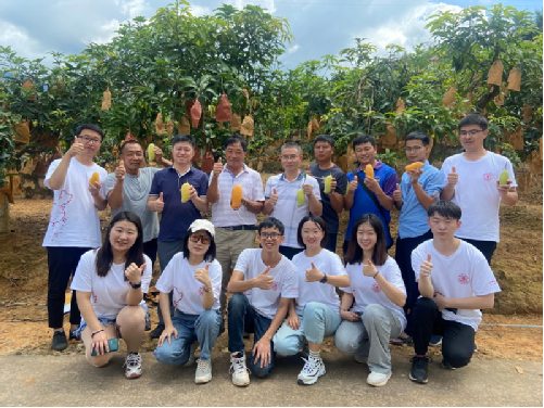 一是恩樂鎮(zhèn)復興村晚熟芒果基地調(diào)研。9月3日上午實踐團前往恩樂鎮(zhèn)復興村晚熟芒果基地考察,了解該基地的主要栽培品種,提出當?shù)孛⒐耘嗟膬?yōu)勢及目前亟需解決的問題,并為農(nóng)戶進行相關栽培技術的講解,為當?shù)赝硎烀⒐毣芾硖峁┘夹g支撐。同時實踐團選取不同海拔生長旺盛、豐產(chǎn)、穩(wěn)產(chǎn)的成年樹,隨機采摘果形均勻、健康飽滿、無機械損傷和病蟲害的成熟果,以及套上不同果袋子的果實,如白袋、紅袋和黃袋,所有樣品采摘后立即送回實驗室,對其單果重,果實縱徑、橫徑、厚度、總可溶性固形物、果形指數(shù)及風味等綜合性狀進行測定,探究不同海拔和果袋對芒果果實品質(zhì)的影響,以期為生產(chǎn)實踐提供理論指導,提高果實品質(zhì)。