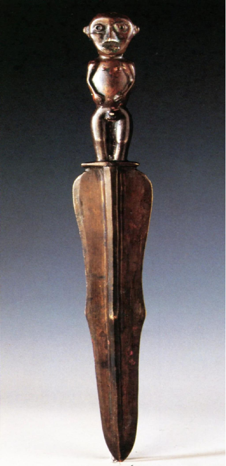 首先是對當?shù)匦率鲿r代文化因素的繼承和延續(xù),以男女立人形青銅短劍為例,其圓雕人像造型,是對遼西地區(qū)人形雕塑傳統(tǒng)的繼承。與小河西文化陶塑人頭像、興隆洼文化石雕人像、趙寶溝文化陶塑人頭像、紅山文化陶塑人像、小河沿文化人形陶壺等一脈相承,雖然人像造型和載體略有不同,但未曾間斷,體現(xiàn)了遼西地區(qū)史前文明的祖先崇拜和宗教祭祀禮儀傳統(tǒng)的延續(xù)性。人像造型既是禮制的最高呈現(xiàn),同時具有標志身份和地位的功能。