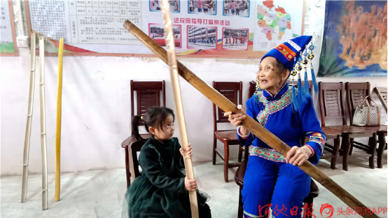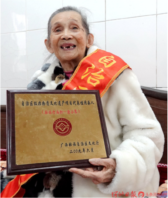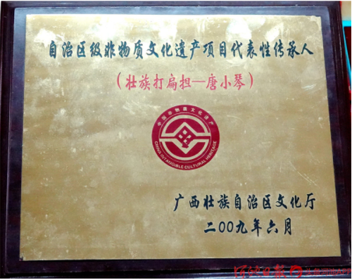今年已經(jīng)88歲高齡的“壯族打扁擔(dān)”技藝傳承人唐小琴,她從小即耳濡目染,跟村里老人、長者學(xué)習(xí)打扁擔(dān),后因打扁擔(dān)需要指揮,又學(xué)習(xí)皮鼓打法。1961年4月,唐小琴從學(xué)校調(diào)入縣文化館任文化藝術(shù)輔導(dǎo)員,挖掘整理了《壯族打扁擔(dān)》《板凳舞》《斑鳩舞》等一大批傳統(tǒng)舞蹈,并多次在自治區(qū)、河池地區(qū)的比賽、調(diào)演上獲獎(jiǎng)。1986年退休后,仍然致力于《壯族打扁擔(dān)》的傳承工作,2004年,組建都安縣老干康樂藝術(shù)團(tuán),帶動(dòng)安陽鎮(zhèn)退休老人學(xué)習(xí)打扁擔(dān)技藝。2009年,她被確認(rèn)為自治區(qū)非物質(zhì)文物遺產(chǎn)項(xiàng)目“壯族打扁擔(dān)”代表性傳承人。
