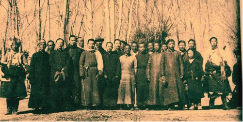 1948年,拉薩小學校長邢肅芝(左起第七腰間佩槍者)應邀赴尼泊爾訪問前與學校教職員及部分家長合影留念