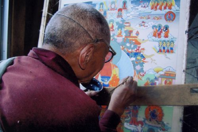 嘎瑪噶赤畫派,屬西藏東部地區(qū)畫派。相傳由郎卡扎西所創(chuàng),與其同時期的八世噶瑪巴米久多吉,奠定了嘎瑪噶赤畫派的理論基礎(chǔ)。十六世紀(jì),嘎瑪噶赤畫派開始盛行康區(qū),先后涌現(xiàn)出了一批大師。嘎瑪噶赤畫派在發(fā)展過程中,由于生存地域與漢地緊密相連,在政治、經(jīng)濟(jì)、文化上的交往也相對頻繁,尤其在繪畫方面,多受漢地明代以后工筆重彩畫和四川綿竹木版年畫的影響。嘎瑪噶赤畫派在嚴(yán)格繼承傳統(tǒng)繪畫的基礎(chǔ)上大膽創(chuàng)新,吸收漢族畫家工筆重彩之精華,注重抒情寫意之風(fēng)格;講究色彩對比,結(jié)構(gòu)嚴(yán)謹(jǐn),畫工細(xì)膩,最后達(dá)到精美絕倫之境界。其總體風(fēng)格形成了有別于衛(wèi)藏地區(qū)門唐、欽澤兩大畫派的特征。二十世紀(jì)初,噶瑪噶赤畫派藝術(shù)更為完善和成熟。