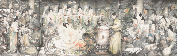 劍器舞也有著悠久傳統(tǒng),早在春秋戰(zhàn)國時代,孔子的學(xué)生子路,戎裝見孔子,曾拔劍起舞。學(xué)生拜見老師舞劍,當(dāng)然只是表演技藝,是對老師致敬的意思。湖北隨縣戰(zhàn)國初期曾侯乙墓出土的鴛鴦盒上的樂舞圖案中,鼓旁的舞者腰間掛著短劍,說明劍舞可能是當(dāng)時頗為流行的一種舞蹈形式。楚漢相爭時,劉邦、項羽宴于鴻門,項莊說:“君王與沛公飲,軍中無以為樂,請以劍舞?!表椨鸨硎就猓谑琼椙f拔劍起舞,逐漸靠近劉邦,企圖借機(jī)殺死劉邦,在場的項伯見劉邦危急,也以劍伴舞,保護(hù)劉邦不被項莊殺害。這個故事表明,當(dāng)時筵宴中有舞劍作為助興表演的風(fēng)俗。唐代,杜甫作《故武衛(wèi)將軍挽歌三首》,有“舞劍過人絕”句。可見當(dāng)時許多人會舞劍,而且各有絕招。公孫大娘最為擅長的《劍器舞》,是《裴將軍滿堂勢》。杜甫曾觀其舞,并寫了《觀公孫大娘弟子舞劍器行》一詩,觀者如山,可見此舞技巧之高。