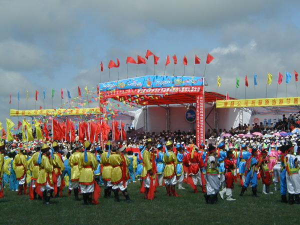 大草原最宜人的時(shí)節(jié)莫過于七八月。屆時(shí),蒙古族牧民們,就會穿上盛裝,不管路途多遠(yuǎn),男女老少,舉家乘車騎馬,云集到綠海如茵的草原上。世界各地的游人也會紛至沓來,素日寧靜的草原頓時(shí)沸騰起來,藍(lán)天白云之下,彩旗飄揚(yáng),人流涌動(dòng),羊歡馬叫,呈一派繁榮景象。這就是蒙古民族一年一度的草原盛大節(jié)日——那達(dá)慕大會隆重開幕。