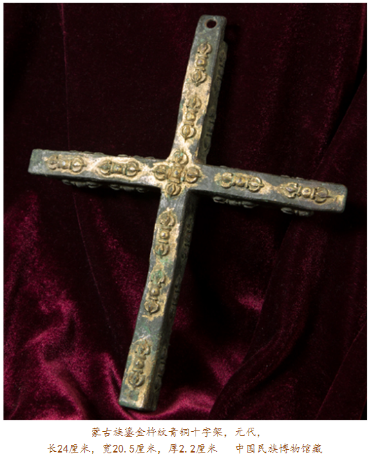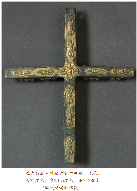 眼前此件在內(nèi)蒙古達(dá)茂旗出土的元代鎏金青銅十字架,四面排列有浮雕金剛杵紋,其正面每個(gè)金剛杵圖案上均有鎏金裝飾,十字架上部穿孔則可用于懸掛。金剛杵是藏傳佛教里的修行法器,象征力量與智慧;而十字架則是基督教文化的標(biāo)志,如此混搭,歷史便要傳遞出種種:在信仰藏傳佛教的蒙古高原,金剛杵,象征無(wú)畏圓滿,十字架,則代表救贖重生,東西方文化的結(jié)合亦呈現(xiàn)某種文明可能達(dá)到的無(wú)可比擬之高度。