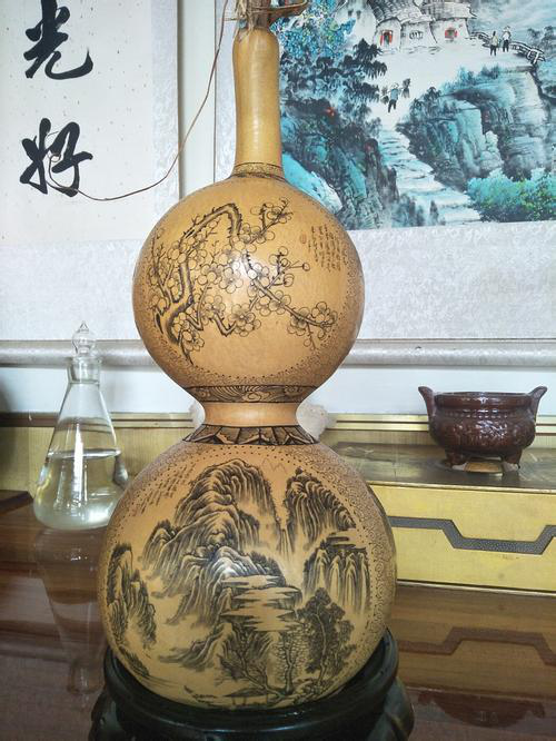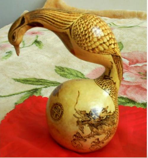 葫蘆雕集繪畫、書法、篆刻藝術(shù)于一體,傳承和發(fā)展了我國傳統(tǒng)“葫蘆文化”。甘肅的雕刻葫蘆最早出產(chǎn)于蘭州,距今約100多年,據(jù)說早期的蘭州雕刻葫蘆比較簡單,對葫蘆不會做刮皮、磨光等加工處理,也不填色;只是在葫蘆表皮雕刻出山水、風(fēng)景或戲劇人物,作為兒童的玩具,在街頭巷尾出售。到了清代光緒年間,秀才蘭州人李文齋對葫蘆雕刻工藝做了改進(jìn)。他針對當(dāng)時雕刻表面粗糙、題材單調(diào)的弊端,首先將葫蘆原生表皮刮去、磨光,并用鏹水混合燃料,染成紅黃二色,是雕刻的景物不易脫落;其次,擴(kuò)大圖案創(chuàng)作題材,在原有山水、花草等圖案基礎(chǔ)上,增加了如《桃花源記》、《蘭亭集序》、《竹林七賢》等歷史文化和神話故事,形成了圖文并茂的題材格局;最后是在雕刻工具上采用了以針代刀,使圖案形象更加情景交融,栩栩如生。其雕刻葫蘆的特點主要是求其意態(tài)之美,追求神似;人物寥寥數(shù)筆,山水花卉濃淡相宜,形神兼具,求其風(fēng)雅;題款文字、細(xì)如蚊足,點綴成行,瀟灑自如。
