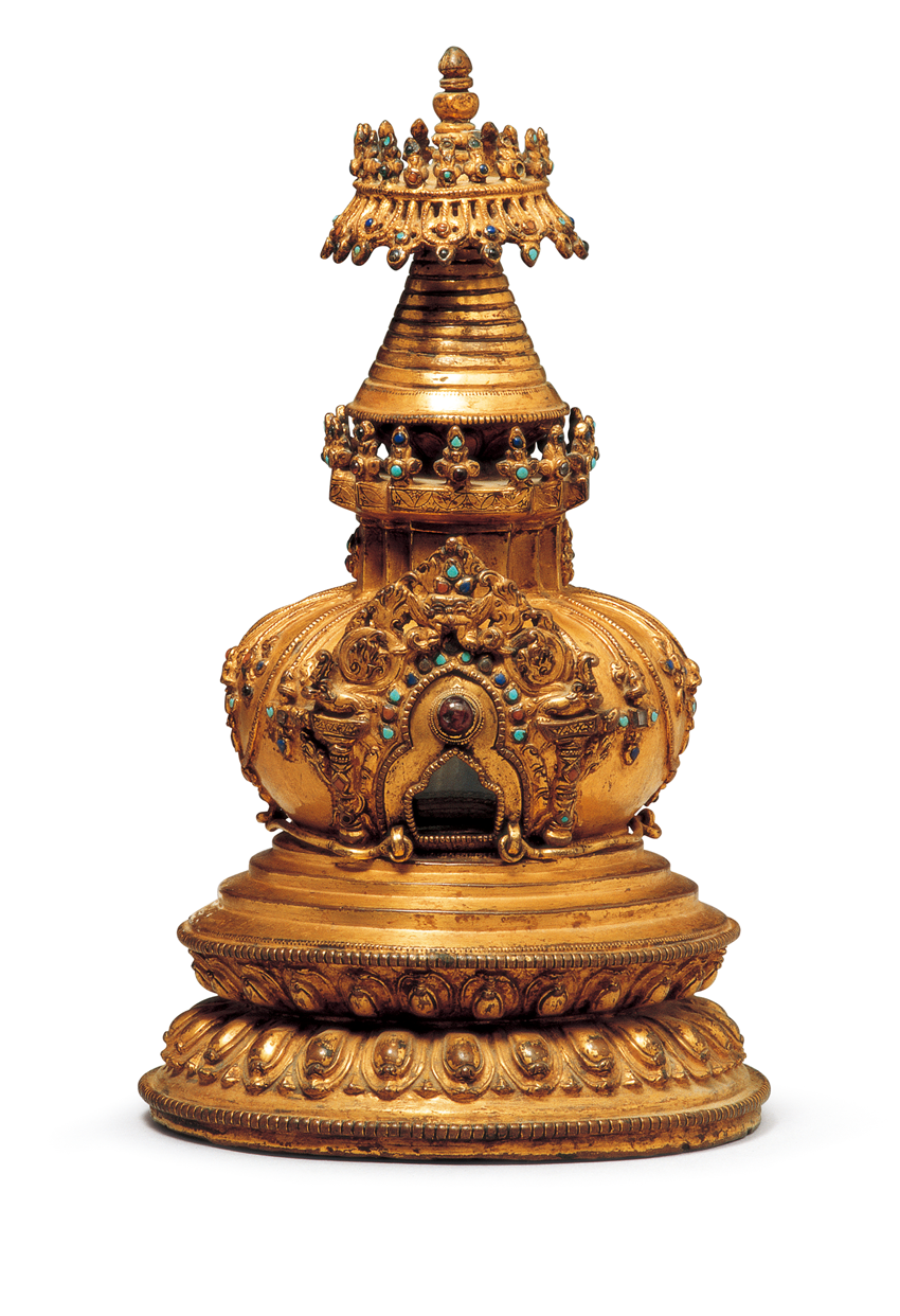 青海一些牧區(qū),天葬日凌晨,死者最小的兒子將尸體抱出帳蓬,人們把已經(jīng)捆好的尸體和一個(gè)裝滿土石的口袋連接起來(lái)搭在牛背上,或由天葬師背尸體到火葬場(chǎng),送葬者不能回頭、不能喧嘩、不能停步。到天葬臺(tái)后,除留一個(gè)非親屬的老人外,其余人全部撤離,然后天葬師將尸體肢解喂禿鷲。如果禿鷲將碎尸吃干凈,意味著死者生前行善積德,其靈魂已升天,如果禿鷲沒吃干凈,說(shuō)明死者生前有罪孽,家人要給寺院布施,請(qǐng)求寺院僧人再做法事,以贖死者罪惡,讓靈魂早日升天(圖為鎏金紫銅舍得塔)。