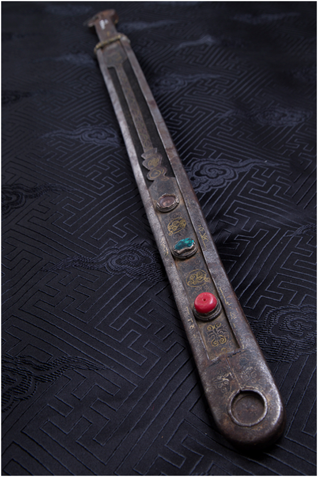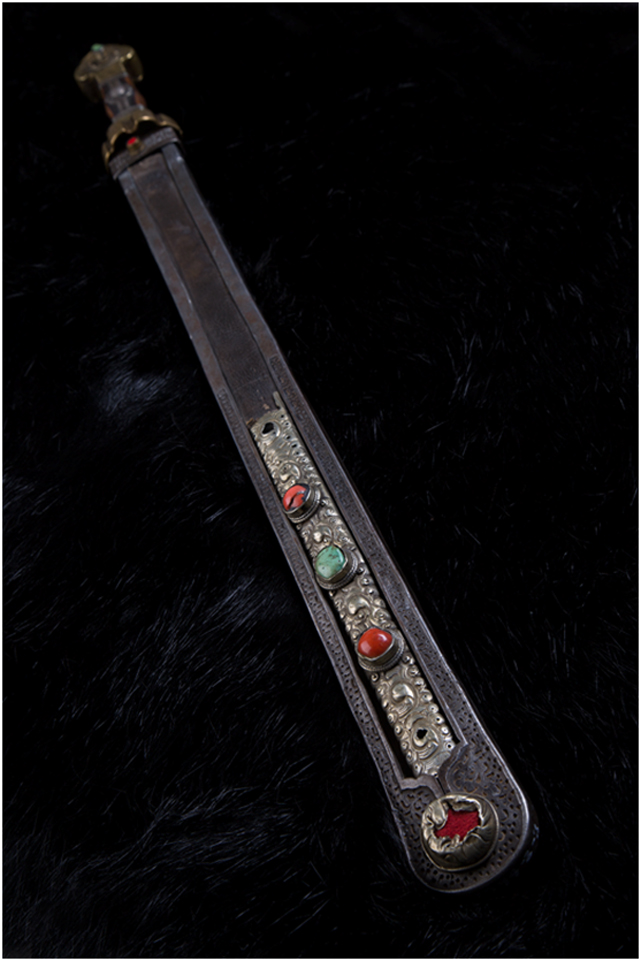 安多地區(qū)主要以放牧為主,牧民的刀主要用于宰殺和吃肉,有嚴格的男用女用之分,男式刀長度在一尺以上,女式刀在一乍左右,刀鞘的底部和刀柄的末端上翹,呈船形。安多人喜歡珠寶,頭飾、胸飾、腰飾無不光燦耀人,這些飾物同樣被用在刀上,刀鞘和刀柄錨金錯銀,鑲嵌著珊瑚和綠松石,像精美的藝術品。