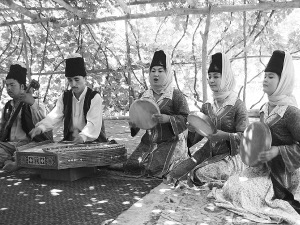 在新疆夏日綠色的葡萄架下,或是在鄉(xiāng)村、城市的茶館或飯館中,熱愛木卡姆的人們無論是荷鋤歸來或是工作歸來,都會(huì)拿著樂器,在鏘的彈奏者周圍引吭高歌。那時(shí),木卡姆的聲音就徘徊在小巷路口,聞聲駐足的人有時(shí)就忘了回家,圍觀的小“巴郎子”(意為“小伙子”)忍不住沖進(jìn)去,用可愛的舞姿引起歡聲一片,這時(shí)鏘的演奏也就越發(fā)高吭而明亮。