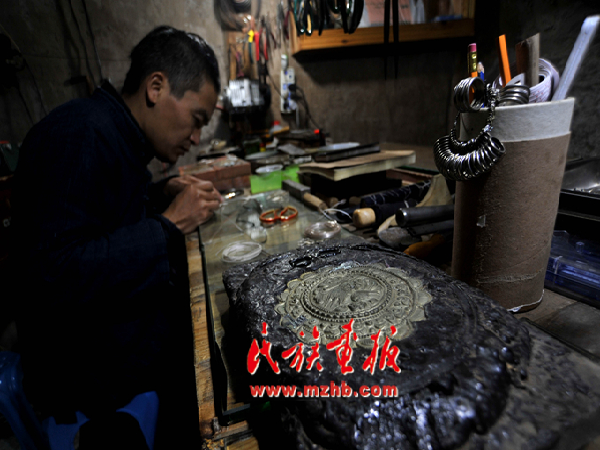 將事先手工打磨好的銀絲擺放在需要鑲嵌的位置,然后用焊槍整體加溫。該過程需要嚴(yán)格控制溫度,溫度高則熔斷銀絲,溫度低則鑲嵌不牢固。制作過程最難把握的是鏨刻與焊接。鏨刻的掌握全憑手上的感覺,用力過大容易將銀片鏨通,力道不夠又不能將紋理的層次感突顯,這是檢驗(yàn)一個銀匠師傅技藝是否成熟的標(biāo)準(zhǔn)之一。