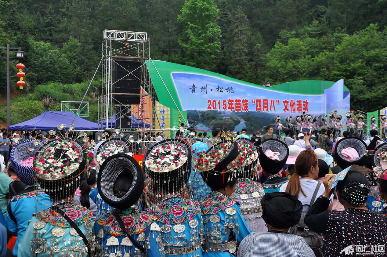 “四月八”的由來傳說甚多,主要是為憑吊“四月八”葬于今噴水池一帶的古代苗族英雄,輩輩相傳,而成習(xí)俗。傳說古代有一個(gè)名叫“亞努”的苗族首領(lǐng),領(lǐng)導(dǎo)苗民向統(tǒng)治者進(jìn)行斗爭。他曾組織各寨苗族頭人在“喝血坳”地主喝雞血,發(fā)誓共同聯(lián)合,戰(zhàn)斗到底。并約定四月八日在某山聚眾起義。起義后,義軍連連獲勝,一直打到了四川、貴州。第二年的四月八日,亞努不幸戰(zhàn)死在貴陽市的噴水池附近。苗族人民為了紀(jì)念這位民族英雄,便于每年的四月八這一天,舉行紀(jì)念活動(dòng),追思亞宜的業(yè)績,為戰(zhàn)死者掃墓。清代乾嘉苗民起義后,統(tǒng)治者禁止湘西苗族人民舉行這一活動(dòng),新中國成立后經(jīng)國家民委批準(zhǔn),將“四月八”定為苗族統(tǒng)一的節(jié)日(圖為2015年貴州松桃苗族“四月八”節(jié)慶盛況,引自貴州銅仁政府網(wǎng)“同仁社區(qū)”)。