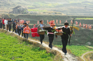 貴州省丹寨縣排調(diào)鎮(zhèn)苗族青年結(jié)婚,婚禮簡(jiǎn)單淳樸,形式別具一格。女孩子出嫁視家庭條件陪送谷子或糯米,家庭...