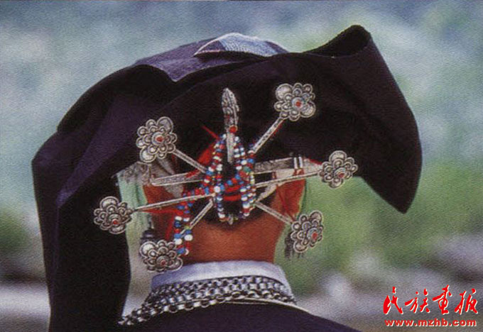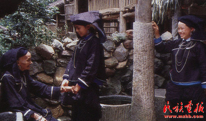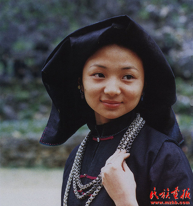 婦女的服飾更具特點(diǎn),無(wú)論老少,都喜歡穿右蓋大襟和葫蘆狀矮腳圓領(lǐng)的緊身短式上衣,下身以寬褲腳、大褲頭的褲子相搭配,腰系黑布做成的大圍裙,頭帶黑布大頭巾。其圍裙既寬且長(zhǎng),戴時(shí)能系周身有余,裙底垂掛到小腿下部,圍裙不僅作為裝飾,而且可以作為勞動(dòng)工具,遇趕圩或走親訪友和勞動(dòng)時(shí),可將圍裙底翻卷上來(lái)作成小包袱,用以包裝和盛裝物品。婦女頭巾都是一塊自己紡織染成的長(zhǎng)條黑布,戴時(shí)先圍繞在頭上,然后翻折擺布成火棱形的圖樣,罩在整個(gè)頭上,再把頭巾的兩端分別垂掛到雙肩上,看上去樸素美觀。同時(shí)還可以當(dāng)做帽子遮蔭用。她們的衣邊、衣角、袖口、裙邊和頭巾的四邊都用紅布或黃布剪成小條以后鑲捆上去,有的則用紅、黃、藍(lán)色絲線繡成波浪形的線條,使黑中襯出紅、黃、藍(lán)色的線條來(lái),清雅明亮,色彩協(xié)調(diào)。再加上頭發(fā)插著龍頭形的銀簪,頸項(xiàng)上帶有銀鏈或項(xiàng)圈,手帶銀圈、玉鐲,耳掛珍珠耳環(huán)等,使人一看,黑中閃艷,樸素之中亦有玲瓏之美,表現(xiàn)了她們獨(dú)特的審美觀。