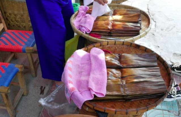 褡褳粑是布依族人民喜愛的傳統(tǒng)食品,因其如褡褳袋而得名。每逢農(nóng)歷七月十五日(中元節(jié)),布衣族人民均普遍制作褡褳粑,作為祭祀祖先的供品。相傳兩千多年前,祭祖是用當(dāng)?shù)厥a(chǎn)的芭蕉果和普通糍粑,后來發(fā)展為用芭蕉和糯米蒸熟,加上紅糖,制成甜味糍粑。又經(jīng)過多次改進才形成現(xiàn)在的褡褳粑。如今,除七月十五日以外,逢年過節(jié),宴客,走親訪友,也要制作褡褳粑。蒸熟后的褡褳粑呈長方形,色澤醬黃,香甜細膩,具有芭蕉果和芭蕉葉的特殊香味。熱吃軟滑細膩,冷吃清涼甜潤,烙食香脆。