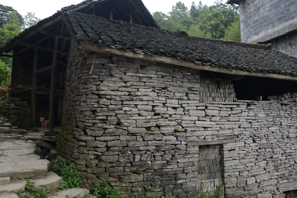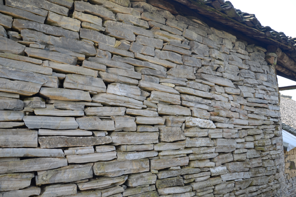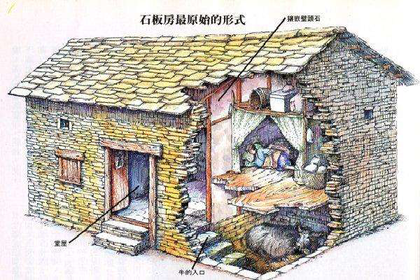 石板房以石條或石塊砌墻,墻可壘至5至6米高;以石板蓋頂,風(fēng)雨不透。總之,除檁條、椽子是木料外,其余全是石料,甚至家用的桌、凳、灶、缽都是石頭鑿的。一切都樸實(shí)無(wú)華,固若金湯。這種房屋冬暖夏涼,防潮放火,相對(duì)采光較差。