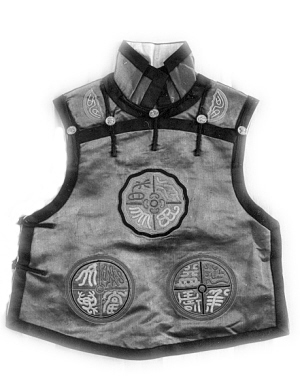 民族文化宮博物館珍藏的這件巴圖魯坎肩,為典型的清代滿族官員、貴族服飾。湖藍(lán)色綢緞面,月白色素紡絲綢里...