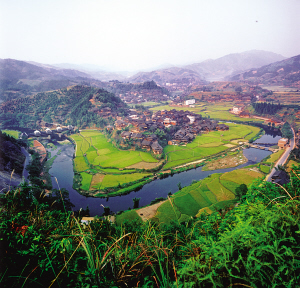侗家人聚族而居,多是一姓一寨,或幾戶同寨,但分片而居。村寨多建于有河流的山腳下,榕樹參天、群山環(huán)抱、流水潺潺,寨邊風(fēng)雨橋橫跨村頭寨腳的溪流之上。寨內(nèi)鼓樓聳立,干欄式木樓廊檐相接,鱗次櫛比,加上侗族人擅長用水車提水種植水稻,登高望去,真是一派山明水秀的田園景象。