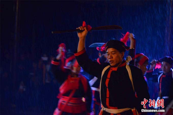 12月6日夜晚,在中國瑤族之鄉(xiāng)廣西金秀瑤族自治縣瑤族百姓在盤王節(jié)上,展現(xiàn)當(dāng)?shù)噩幾迕耖g絕技——下火海