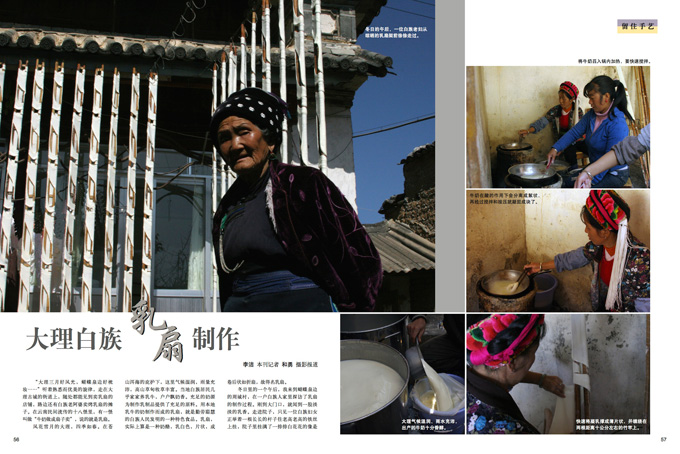 風(fēng)花雪月的大理,四季如春。在蒼乳扇山洱海的庇護(hù)下,這里氣候濕潤(rùn),雨量充 沛,高山草甸牧草豐富。當(dāng)?shù)匕鬃寰用駧缀跫壹茵B(yǎng)乳牛,戶戶飄奶香。充足的奶源為制作乳制品提供了充足的原料。用本地乳牛的奶制作而成的乳扇,就是勤勞聰慧的白族人民發(fā)明的一種特色食品。乳扇, 實(shí)際上算是一種奶酪,乳白色,片狀,成卷后狀如折扇,故得名乳扇。