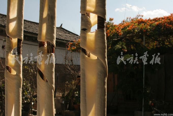 冬日里的一個(gè)午后,我來到蝴蝶泉邊的周城村,在一戶白族人家里探訪了乳扇的制作過程。剛到大門口,就聞到一股淡 淡的乳香。走進(jìn)院子,只見一位白族婦女正舉著一根長(zhǎng)長(zhǎng)的桿子往老高老高的鐵絲上掛,院子里掛滿了一排排白花花的像是裹著白布的竹桿。走近一看,桿子上白白的東西并不是白布,向?qū)Ц嬖V我,這就是乳扇。