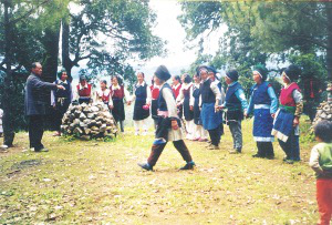 頌藥仙活動各村為陣,是一項(xiàng)以傳授藥物知識和防病方法為主題的歌舞活動。早早吃過晚飯后,人們集中到白天洗揀藥物的水邊,用青松和花草編扎的轎子抬上藥仙的肖像,敲鑼打鼓、載歌載舞,把藥仙抬到她的化身“定居”的山林中,舉行頌贊藥仙功績的儀式?;顒訄龅厮闹?,插遍各種花枝,花枝上掛滿姑娘們精繡的荷包,荷包中裝的是各種治病的藥粉。場中央燃燒著熊熊篝火,火邊供著藥仙的肖像。參加活動的人,各持兩束用藥用植物編成的“花束”,在歌頭的帶領(lǐng)下,眾人手舞“花束”,環(huán)篝火踏歌而舞。用動聽的歌聲,歌唱藥仙嘗百草、治疾病的故事;介紹用中草藥防病、治病的知識……踏歌接近尾聲時,人們便把手中舞耍的“花束”丟進(jìn)篝火中焚燒,象征把各自身上的病疾丟盡,實(shí)際上是借焚藥草來達(dá)到消毒防病的目的。