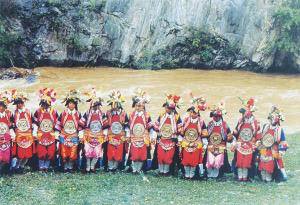 活動的最后一套儀式,便是送藥和摸荷包。所謂送藥,即人們把自己認(rèn)為最好的藥草,用紅頭繩拴捆成束,唱著祝福歌相互贈送。摸荷包即把各人的雙眼用手帕遮住,讓他(她)唱著《許愿歌》,去摸取一個系在活動場地四周那些插著的花枝上的荷包。據(jù)說,摸到荷包,就表示能夠得到藥仙的佑護(hù),終生不會生病。