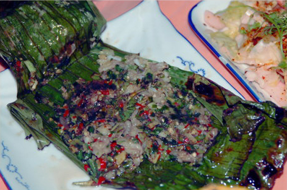 傣族傳統(tǒng)家常風(fēng)味菜,特點(diǎn)是軟嫩鮮甜,原汁原味。制法是將鮮魚(yú)去鰓和內(nèi)臟,洗凈,將蔥花、姜末、蒜末、青椒末、青姜葉末、芫荽末、野花椒葉末、薄荷、茴香葉末、香茅草葉末、草果粉、味精、鹽、料酒拌制成餡,裝入魚(yú)腹,頭尾折攏,再用香茅草捆成十字,外面包以芭蕉葉,埋入木柴燒后的炭或熱灰中燒熟,取出去掉芭蕉葉和香茅草,裝盤(pán)即成。
