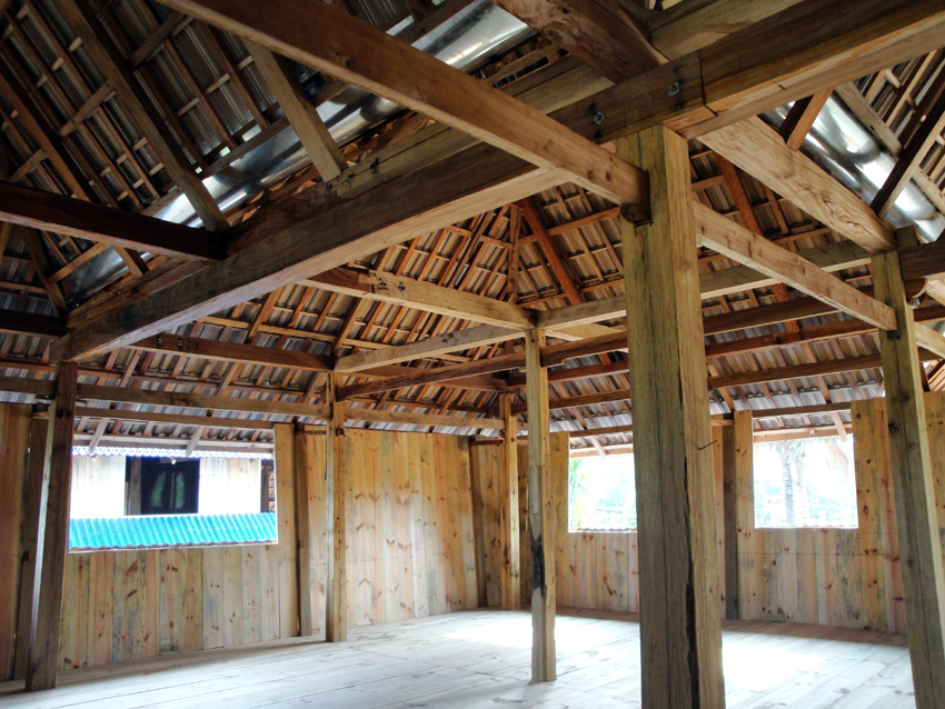 德宏瑞麗一帶的竹樓由“干欄”和平房兩部分組成,“干欄”是住房,平房是廚房?!案蓹凇倍酁殚L方形,下層架空,可堆放雜物。上層做橫向分割,成一間堂屋和數(shù)間臥室。堂屋中設有火塘,一般用于燒茶,在一角設有佛龕。堂屋外有開敞的前廊和曬臺。屋頂為歇山式,脊長,坡面平緩,外墻開窗,有的還是落地窗,墻與屋頂之間有縫隙,這些都加強了室內(nèi)空氣的流通,達到了室內(nèi)陰涼的效果。
