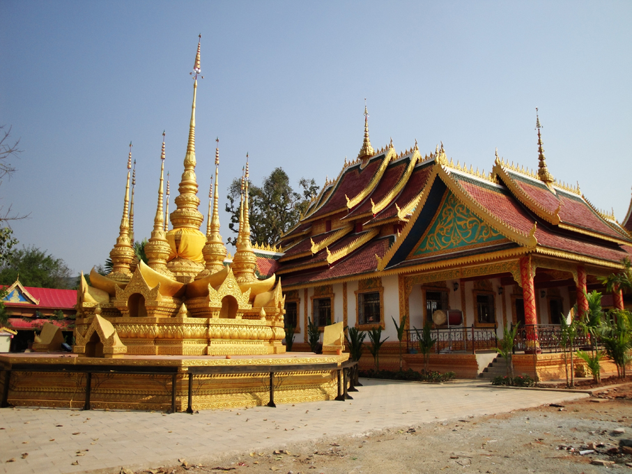 佛寺建筑是信仰小乘佛教的傣族地區(qū)建筑的一大特色,以落地重檐多坡面平瓦建筑為主。由大殿、僧舍和鼓房組成,中心佛寺外加一座戒堂、一座藏經(jīng)樓、一座佛塔。主殿外觀一般是單檐或重檐歇山式屋頂,或懸山式頂、多角或亞字形重檐歇山式頂。坡面進行一至二次跌落后有兩層或上中下三層的單面坡或三面坡、五面坡,坡面的多少和佛寺的級別有關(guān)。屋面按縱向分為兩段式或三段式或五段式,以中間最高,使龐大威嚴的屋面呈現(xiàn)出優(yōu)美起伏的曲線。