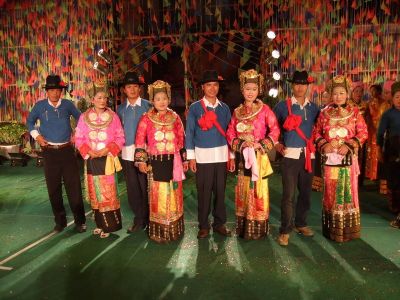主婚人念完祝詞以后,新郎、新娘各在桌上揪下一團糯米飯,蘸點米酒、食鹽、舂鹽捧、芭蕉后擺在桌前。主婚人拿起一條長長的白線,從左至右纏在新娘、新郎的肩背,將白線兩端搭在“茂歡”之上,表示將一對新人的心拴在一起。然后再拿兩縷白線,分別纏在新郎、新娘的手腕上,祝愿新婚夫婦百年好合,無災無難。在座的長者也各拿兩縷白線,分別拴在新郎、新娘手上,邊拴線,邊念些祝愿詞。拴完線后,婚儀基本結(jié)束,婚宴開始,新郎新娘向賓客敬酒致意。