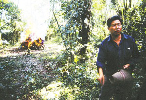 進(jìn)入墓葬地,茂盛的野草,蔽日的樹林,不時(shí)進(jìn)入眼簾的墳堆,還有一伸一縮往人腳上爬的螞蟥,讓人毛骨悚然。來到一塊剛砍過的開闊地,中央挖了一個(gè)坑,里面滿是倒插著的樹柴,柴堆上還放著兩個(gè)舊汽車輪胎。巖化告訴我說:“一次火葬需要兩拖拉機(jī)柴,如果死者家里沒有柴,我們就會每家湊一兩根,直到湊夠?yàn)橹?。用車輪胎是為了更好的燃燒。”人們把棺材停放在柴堆的左?cè),將“恒叫”取下,巖約將棺材蓋板掀開,用從家里帶來的一個(gè)竹筒里的水朝死者臉上倒。巖約告訴我:“這是給死者洗臉,幫她打扮一下?!比缓螅蠓馉旈_始念經(jīng),經(jīng)文的大意是:“山上的神啊,我們的親人到這里居住,你們要好好服侍她,把周圍看管好!邪惡的鬼啊,這里是我們親人應(yīng)有的地盤,你們不得侵犯,你們不要來擾亂!”念完,就一個(gè)人先走了。然后,人們雙手合掌,掌中緊握一根蠟條,圍著轉(zhuǎn)了三圈,婦女們也先走了。邊走還邊相互告誡,不要回頭看,不然死人的鬼魂會跟著你走。剩下的男人將棺材抬上柴堆,將用白布裹著的死者,頭朝寨子,腳朝外,意思是你已從寨子出來了,以后再也不準(zhǔn)回寨子了。用柴壓著,又把棺材砸碎,將棺材碎片也堆放上去,有人就拿來一個(gè)塑料桶,開始往上潑澆柴油,并從寨子的這方先點(diǎn)火。一會兒,熊熊的大火便燃燒起來。有人拿著用礦泉水瓶子裝著的酒給大家倒,輪流喝。喝過一圈后,他們摘下一枝樹枝,往自己的衣襟前后拍打一陣,將樹枝扔進(jìn)火里。巖化說:我們要走了,這樣做是把身上的鬼氣趕盡。我也敢緊學(xué)著他們的樣子做了一通,便隨人們離去。
