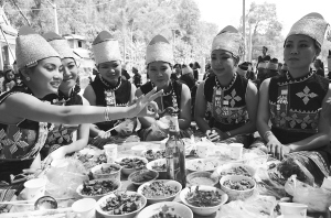 “鳥頭節(jié)”是花腰傣的傳統(tǒng)節(jié)日,村民們通過傳統(tǒng)的祭祀方式,祈求神鳥保佑村寨平安吉祥,來年五谷豐登?,F(xiàn)在“鳥頭節(jié)”已注入了輕松、歡快的內(nèi)容。宴席上,大家將鳥頭用木棍插好放在酒瓶中,輪流彈動(dòng)鳥頭,鳥嘴指向誰,表示誰的運(yùn)氣好,就要喝下一杯酒。這樣飽含祝福、喜慶的勸酒習(xí)俗,為節(jié)日增添了樂趣。圖為花腰傣姑娘們彈動(dòng)鳥頭喝酒。