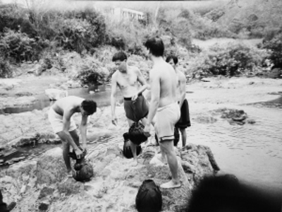 有一天,我在通什(今五指山市)的一條河邊,看見有幾個(gè)黎族人抱著大葫蘆過(guò)河。我趕緊拿出相機(jī),在河邊的大石頭間跳來(lái)跳去追拍。沒想到一不留神就跳空了,重重地摔在石頭上,造成了骨裂,當(dāng)時(shí)就不能動(dòng)彈了,在醫(yī)院里躺了好長(zhǎng)一段時(shí)間。