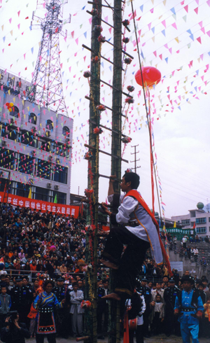 節(jié)日里,婦女們穿著鑲花邊的黑色上衣和點綴著各種銀飾物的花裙,佩戴耳環(huán)、項鏈等首飾,風采奪人。男人穿著麻布短衣褲,腰系紅黃長帶,小腿系吊簡,腰佩長刀,肩挎箭包,英姿勃勃。節(jié)目的廣場上,堅趄兩根二十米高的樹干,四周用藤蔓拉緊固定,樹桿上插有三十六把明晃晃的長刀,作為向上攀登的橫檔,刀刃向上,寒光逼人,謂之“刀竿午間。鞭炮齊鳴,鑼鼓震天”。身穿大紅抱、頭纏紅布包頭、赤腳的五名“玩火者”,齊涌至竿下,圍繞刀竿唱歌跳舞,將斟滿的白酒一飲而盡,縱身飛上刀竿。雙手緊提刀面,運足氣的腳掌斜置在鋒利的刀刃上,勇敢、靈巧地向上攀登。全場鴉雀無聲,大家屏住呼吸仰面觀看,對他們的氣功絕技贊嘆不已。噼噼啪啪的鞭炮聲來自竿頂優(yōu)勝者,響徹云霄。全場歡呼跳躍,爭相向爬桿者敬獻美酒。對歌、跳舞、蕩秋千活動為節(jié)日增添了濃郁的氣氛。丟煙包(煙盒)活動別具一格,青年男女各站一方,互擲煙包,姑娘將小伙的煙包收藏起來,說明姑娘接受了小伙子的愛慕。