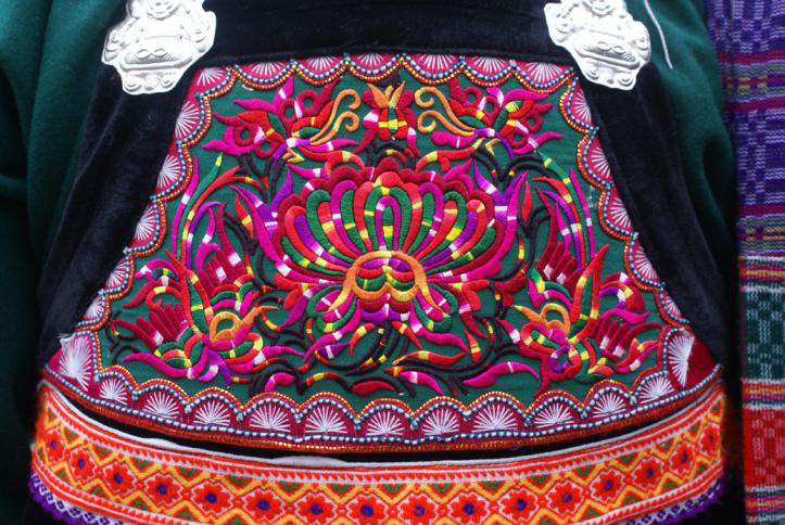 水族有養(yǎng)馬賽馬習(xí)俗,馬尾繡應(yīng)運(yùn)而生。以絲線裹馬尾刺繡制作圖案的好處是馬尾質(zhì)地較硬,能使圖案不易變形,馬尾不易腐敗變質(zhì),經(jīng)久耐用;還有馬尾上含有油脂成分,利于保養(yǎng)外圍絲線光澤;另一奇特之處就是繡品上綴有形如古代錢(qián)幣的銅飾,以紅線穿貼于馬尾繡片里,如星星點(diǎn)點(diǎn)的小花,除了做裝飾外,水族同胞認(rèn)為,銅有驅(qū)邪避兇的功能。在封建社會(huì),銅是鑄幣之物,一些朝代嚴(yán)禁民間鑄銅,馬尾繡里卻繡有銅飾,這充分體現(xiàn)了水族馬尾繡的珍貴文化藝術(shù)價(jià)值。