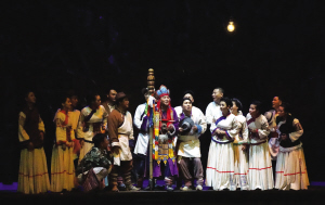 話劇《巴交龍布》由著名導(dǎo)演查麗芳擔(dān)綱總導(dǎo)演。為了實現(xiàn)戲劇擅長的表達方式,該劇把與巴交龍布同行的騾子作了擬人化處理,將這對“難兄難弟”的經(jīng)歷作為貫穿全劇的一條主情節(jié)線。在雙方的對話交鋒中,既有喜劇的幽默,又有正劇的嚴(yán)肅。同時,納西族傳統(tǒng)文化也得到了豐富的體現(xiàn)。劇中,不僅有盛大的納西族婚禮、神圣的東巴祭祀儀式、歡快的納西族歌舞,還有對納西族信守承諾、吃苦奉獻等民族精神的彰顯。
