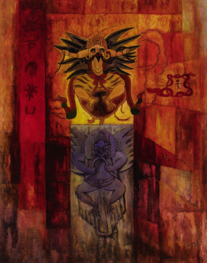我以前所結(jié)識的一批納西族畫家差不多都是上世紀四五十年代出生的,他們大多接受過美院等高等藝術(shù)院校的教育,具有堅實的繪畫功力,有相同的美學見解和共同的探索形成的藝術(shù)追求。它一出現(xiàn)就以其獨特的美學傾向和特殊的藝術(shù)魅力引起世人的關(guān)注。而和向東是上世紀70年代出生的青年畫家,他原來就讀于浙江大學的藝術(shù)設(shè)計專業(yè),只因迷上美術(shù)學理論而走上了創(chuàng)作之路,沒有學院派的背景。他的家鄉(xiāng)云南麗江現(xiàn)在已是聲名鵲起,納西族東巴文化作為世界記憶遺產(chǎn)已聞名海內(nèi)外。作為年輕一代的納西族畫家又該怎么表現(xiàn)東巴文化呢?這個學藝術(shù)設(shè)計的年輕人以設(shè)計師的獨特眼光和思維,一開始就與“現(xiàn)代東巴繪畫派”的中年畫家群體拉開了距離。其作品在保留古老的東巴繪畫藝術(shù)的基礎(chǔ)上,在作品中運用書寫東巴經(jīng)卷的各種形象和文字符號。用當代人的思維觀念和審美意識,運用油畫的技法來表達。畫面大多用平面設(shè)計的構(gòu)成原理,以裝飾性的、形式感極強的、既寫實又抽象的手法表現(xiàn)出原汁原味的納西文化。即使拋開作品主題內(nèi)涵,依然可以從他的作品里感受到一種神秘、古樸、深沉的歷史基調(diào)。因4年前他的創(chuàng)作是在平面設(shè)計為主的業(yè)余時間里完成的,而真正投入精力進行專業(yè)創(chuàng)作是近兩年的事,因此,他現(xiàn)在處于學習、吸收、探索創(chuàng)作的過程中。