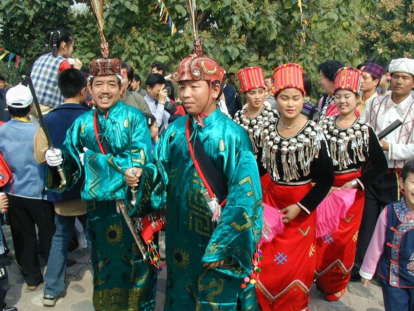 目瑙節(jié):又稱“總戈”,景頗語音譯,意思是“大伙跳舞”。目瑙節(jié)是景頗族最盛大的傳統(tǒng)節(jié)日,一般于每年農(nóng)歷正月十五以后的九天內(nèi)擇雙日舉行,節(jié)期三至五天不等。目瑙作為一種大型的群眾性歌舞活動,由來已久,歷史上,每逢豐年,出征、凱旋、婚姻嫁娶、敬祭鬼神等重要活動,均要跳“目瑙”。景頗族的“目瑙縱歌”原來是一種融宗教和文化習(xí)俗為一體的傳統(tǒng)慶典。隨著社會的發(fā)展,逐漸演化為各種不同類別的“目瑙”。大致有以下幾種:①“歲目瑙”,家庭財源茂盛,人丁興旺時舉行;②“布當(dāng)目瑙”,征戰(zhàn)取得勝利時舉行;③“貢冉目瑙”,同胞兄弟分家自立門戶時舉行;④“騰肯目瑙”,新建房屋住所落成時舉行;⑤“空然目瑙”貴族家娶親辦婚禮時舉行;⑥“達(dá)如目瑙”,出征時舉行;⑦“昔目瑙”,有名望的長者去世送葬時舉行;⑧“柱目瑙”,祭奠“木代”神時舉行。不同類別的“目瑙”都有特定的內(nèi)容和表現(xiàn)形式,但有一個共同點就是整個過程都是由“瑙雙”(領(lǐng)舞)隊和“瑙巴”(表演)隊組成的舞隊來表現(xiàn)和完成的。每逢目瑙節(jié)日,村村寨寨的景頗人身著節(jié)日盛裝,紛紛從四面八方涌入目瑙廣場。廣場上人山人海,氣氛熱烈歡快而不失莊嚴(yán)古樸的特色。廣場中央高豎著四根長約4米的目瑙柱,亦稱雌雄柱,中間兩根為陰,外面兩根為陽,上面皆繪有精美而富有象征意義的圖案:右邊柱上往往繪以蕨菜花紋,象征團(tuán)結(jié)奮進(jìn);左邊常畫回紋構(gòu)成若干個四方形,并涂以不同顏色,表示景頗族的遷徙路線;中間兩根柱子之間,交叉著兩把長刀,為景頗民族驍勇強悍、堅強剛毅性格的具體標(biāo)志。目瑙柱的左側(cè)立著一個方形架子,上層是吹嗩吶的座位;前面掛著一個兩米長的大皮鼓和一面直徑一米多的大芒鑼,供跳舞時伴奏用。廣場四周用竹籬笆圍起,目的是為了防止野鬼的侵入和牲畜的干擾。舞蹈開始時,鼓樂齊鳴,由兩位德高望重且又熟悉目瑙舞路線的老人身穿大龍袍,頭戴飾有孔雀、野雞羽毛和野豬牙齒的目腦帽,手持長刀領(lǐng)頭,后面跟著背銅炮和持長刀的隊伍,婦女們拿著扇子或彩帕跟在最后,邊歌邊舞,熱鬧非凡。參舞者少則百多人,多則幾千人,從清晨到日暮,以日暮到清晨,通宵達(dá)旦,其間舞者跳累時可自動退場小歇片刻,然后繼續(xù)登場舞蹈?!澳胯Эv歌”作為一個民族的傳統(tǒng)活動發(fā)展至今,宗教色彩和類別已日益淡化,它已成為景頗族約定俗成的傳統(tǒng)節(jié)日,統(tǒng)稱為“統(tǒng)肯(傳統(tǒng))目瑙”并賦予了新的內(nèi)涵,其內(nèi)容和形式都是展示一個民族的傳統(tǒng)文化,反映今天的新生活和對未來的美好向往。