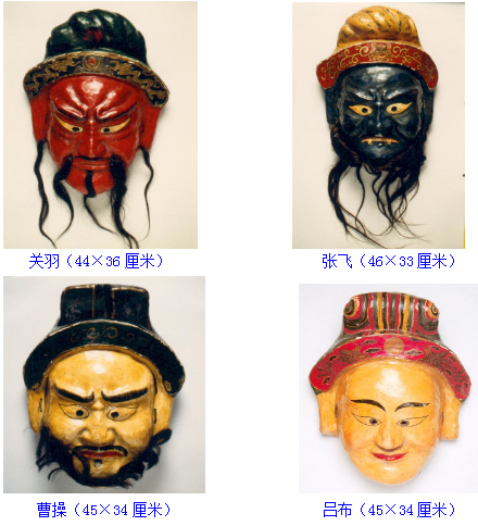 反映三國(guó)內(nèi)容的舞蹈有“五官”“三將”“五將”“關(guān)老爺”等內(nèi)容。面具角色有劉備、關(guān)羽、張飛、曹操、呂布等。表演動(dòng)作疾緩有序,再現(xiàn)了三國(guó)時(shí)驍將馳騁疆場(chǎng)的場(chǎng)面。